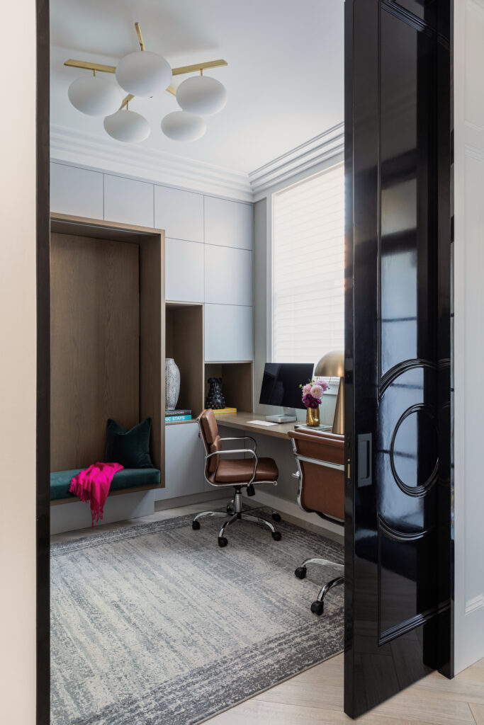Working with a blank canvas, KMG Interiors curated a sophisticated palette of warm taupes, grays, and whites, punctuated by strategic pops of sage green, matte black, and polished brass. Original architectural character was honored throughout, while every new element was selected with the precision of a couture edit.