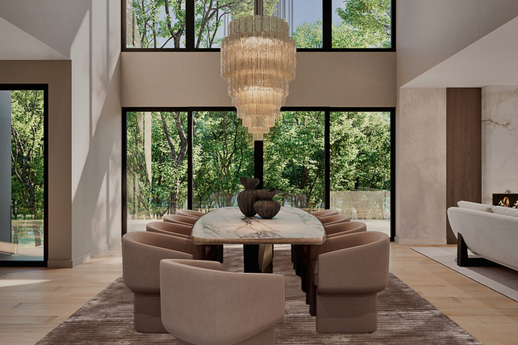 This luxury estate retreat is a masterclass in organic modernism, a design language spoken through the finest materials: book-matched marble with dramatic natural veining, warm walnut paneling, raw plaster, and sculptural boucle. A sweeping curved sectional faces the woodland through walls of glass, anchored by a recessed marble fireplace and a statement globe pendant that reads as pure sculpture. In the dining room, a cascading tiered chandelier of extraordinary scale presides over a marble-top table and curved upholstered chairs, a composition made for evenings that linger. A luxury Upstate New York estate where nature and design become one.